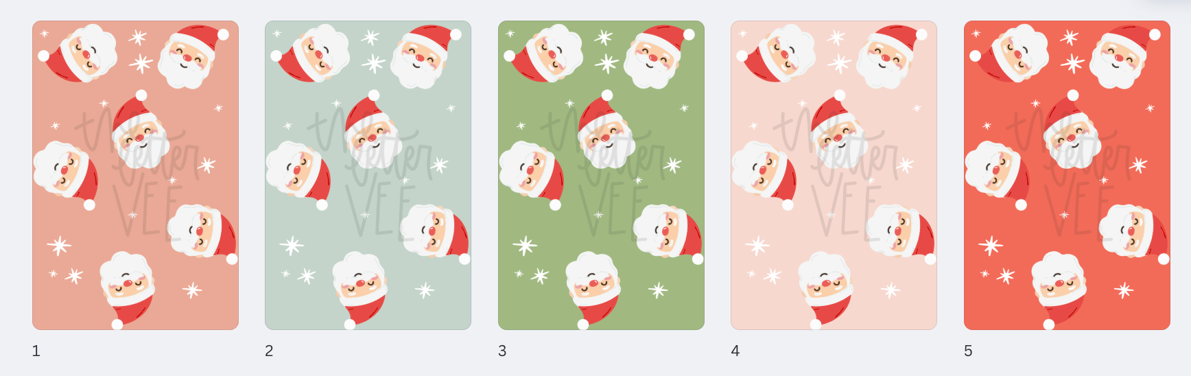 This set of repeating backgrounds features a playful Santa head pattern in five cozy Christmas colorways — perfect for everything from printable tags and treat toppers to party décor, digital scrapbooking, and small business packaging.